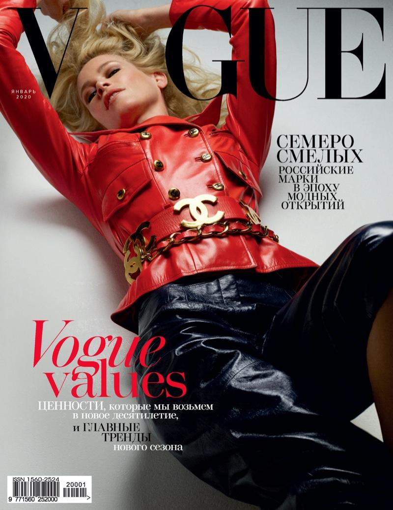 克劳迪娅·希弗 (Claudia Schiffer ) 在《 Vogue》俄罗斯版的封面中脱颖而出。被Cuneyt Akeroglu 抓获瞬间,她身穿猩红色 Chanel 夹克、金色腰带和黑色长裤。在时尚亮片中,克劳迪娅拥抱了一个装满法国品牌的衣橱。这位金发超模由Katerina Zolototrubova 设计,展示了她标志性的容貌。